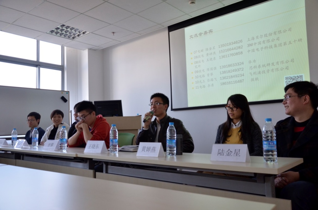 宋伟清简要地向大家介绍了交流会的嘉宾:陆金星(07电磁),黄婵燕(08微电),王晓东(08微电),陈国强(09微电),曾攀(10电路),张路飞(11光工),李涛(11电路)。