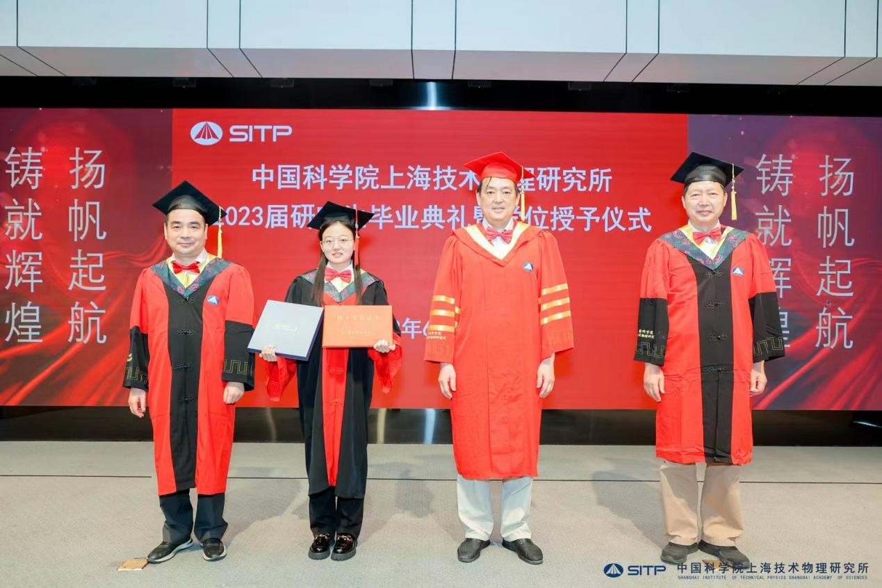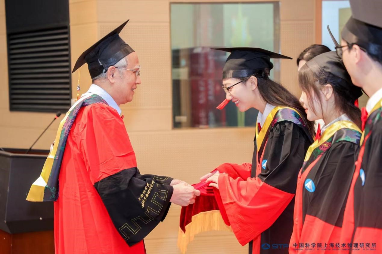 毕业典礼庄重的国歌声中拉开帷幕,现场暖场视频记录了毕业生们在技物所留下的点滴,其中有欢笑,有泪水,经历磨炼,获得成长。仪式环节,丁雷向毕业生代表颁发毕业证书,龚惠兴院士、陈桂林院士为上海市优秀毕业生、国科大优秀毕业生颁发获奖证书。丁雷在致辞中向全体毕业生表示祝贺,他寄语同学们志存高远、勇担重任,积极投身科学事业,着力解决“卡脖子”难题,牢记和发扬技物所求真务实的科研态度,站在一个全新的起点,走向世界,奔向未来。他表示,技物所始终是大家的家,期待同学们常回家看看。
