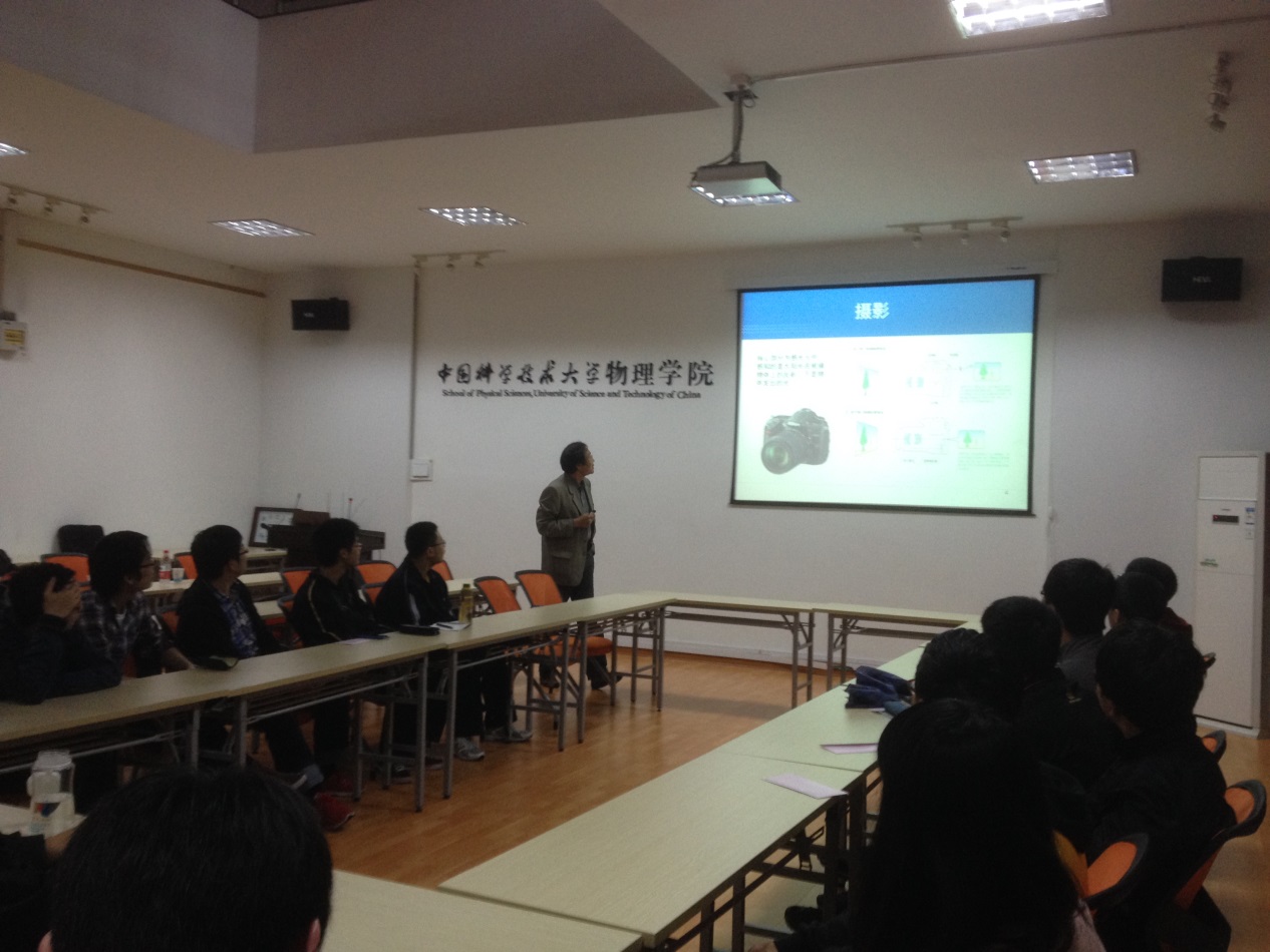 2014年4月21日下午,在中国科学技术大学物理学院二楼会议室中科大技术物理英才班顺利开班。戴宁副所长、李天信、汪骏发、段昌奎、彭慧等老师出席了开班仪式。会上,戴宁、段昌奎、汪骏发分别介绍了英才班建立的目的、过程以及将来活动的方式,戴宁副所长也对同学们提出了殷切希望。会上,冯珂垚自告奋勇担任技术物理英才班班长。开班仪式结束后,戴宁副所长做了首场题为《长波红外光电子物理前沿问题》的学术报告。
