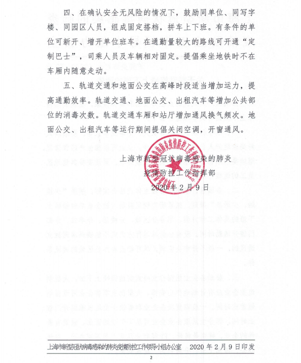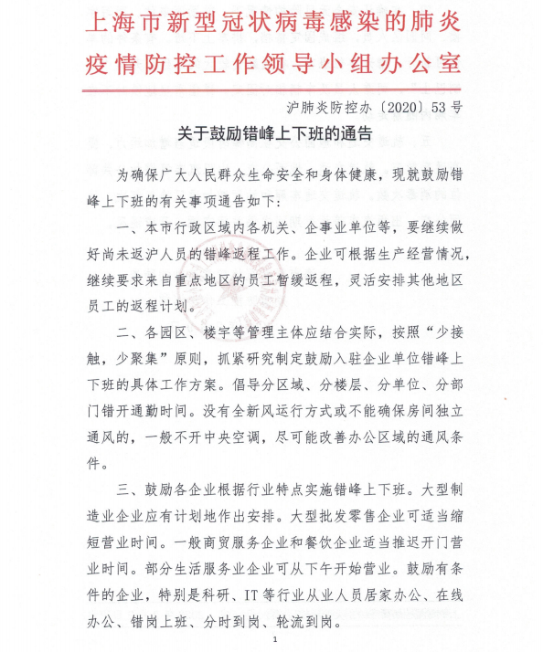 沪肺炎防控办《关于鼓励错峰上下班的通告》